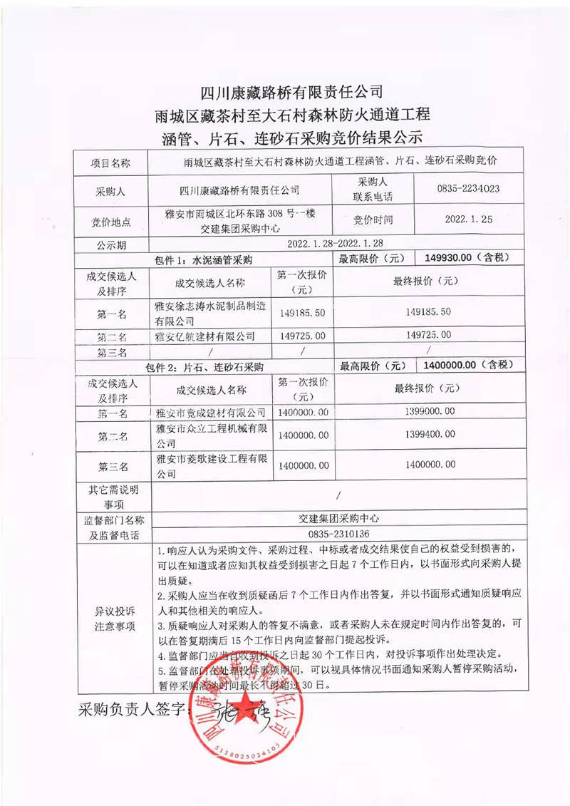 四川康藏路橋有限責任公司雨城區(qū)藏茶村至大石村森林防火通道工程涵管、片石、連砂石采購競價結(jié)果公示