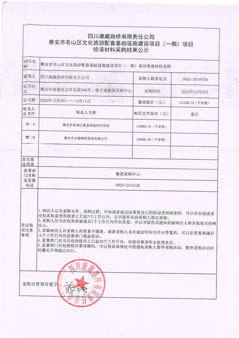 四川康藏路橋有限責任公司雅安市名山區(qū)文化旅游配套基礎設施建設項目(一期)項目噴漆材料采購結(jié)果公示