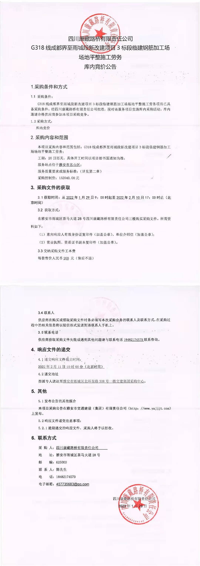 四川康藏路橋有限責(zé)任公司G318線成都界至雨城段新改建項(xiàng)目3標(biāo)段臨建鋼筋加工場場地平整施工勞務(wù)庫內(nèi)競價公告