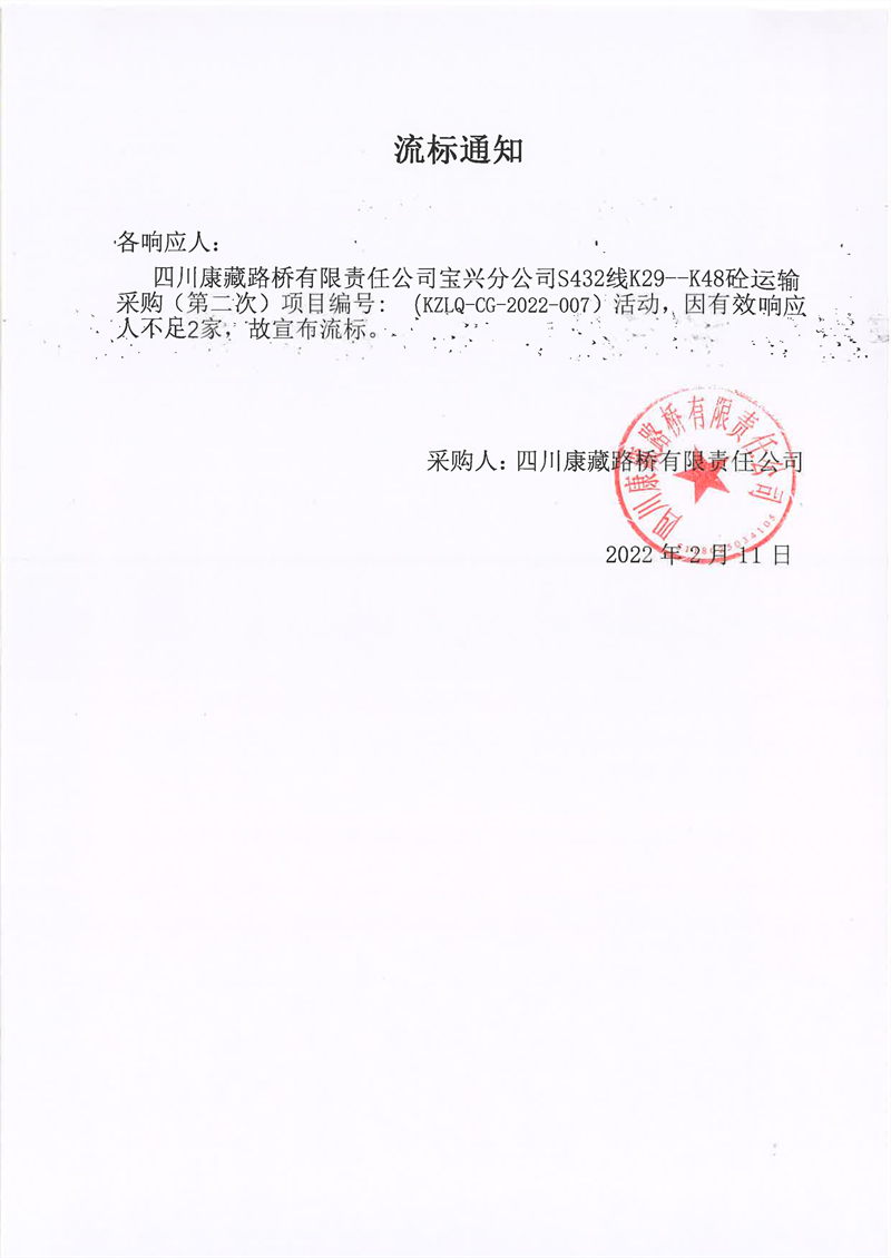 四川康藏路橋有限責(zé)任公司寶興分公司S432線K29-K48砼運輸采購(第二次)項目流標(biāo)通知