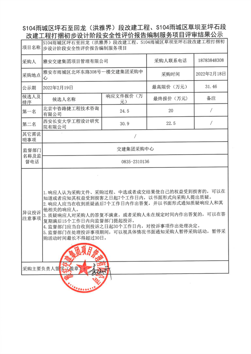 雅安交建集團項目管理有限公司S104雨城區(qū)坪石至回龍(洪雅界)段改建工程、S104雨城區(qū)草壩至坪石段改建工程打捆初步設(shè)計階段安全性評價報告編制服務(wù)項目評審結(jié)果公示