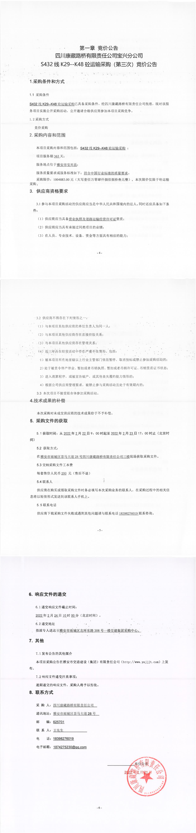 四川康藏路橋有限責(zé)任公司寶興分公司S432線K29-K48砼運(yùn)輸采購(第三次)競(jìng)價(jià)公告