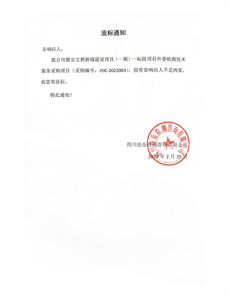 四川佳岳檢測咨詢有限公司雅安文教新城建設項目(一期)一標段項目外委檢測技術服務采購項目流標通知