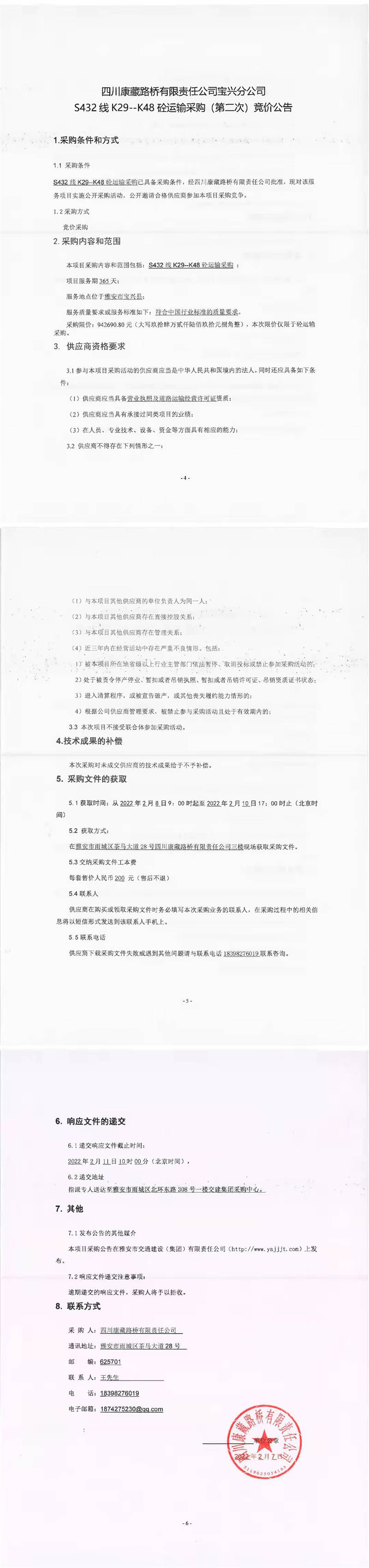 四川康藏路橋有限責(zé)任公司寶興分公司S432線K29-K48砼運(yùn)輸采購(第二次)競價(jià)公告