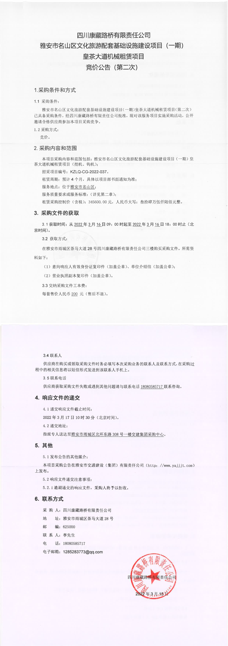 四川康藏路橋有限責任公司雅安市名山區(qū)文化旅游配套基礎設施建設項目(一期)皇茶大道機械租賃項目競價公告(第二次)