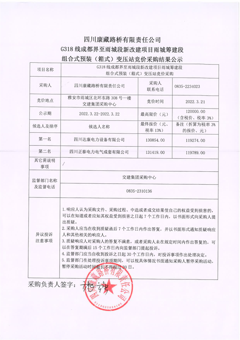 四川康藏路橋有限責(zé)任公司G318線成都界至雨城段新改建項(xiàng)目雨城籌建段組合式預(yù)裝(箱式)變壓站競價(jià)采購結(jié)果公示