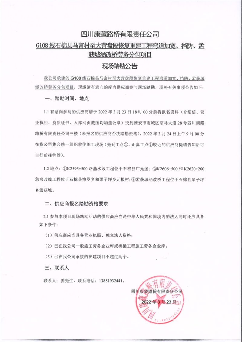 四川康藏路橋有限責(zé)任公司G108線石棉縣馬富村至大營(yíng)盤段恢復(fù)重建工程彎道加寬、擋防、孟獲城涵改橋勞務(wù)分包項(xiàng)目現(xiàn)場(chǎng)踏勘公告
