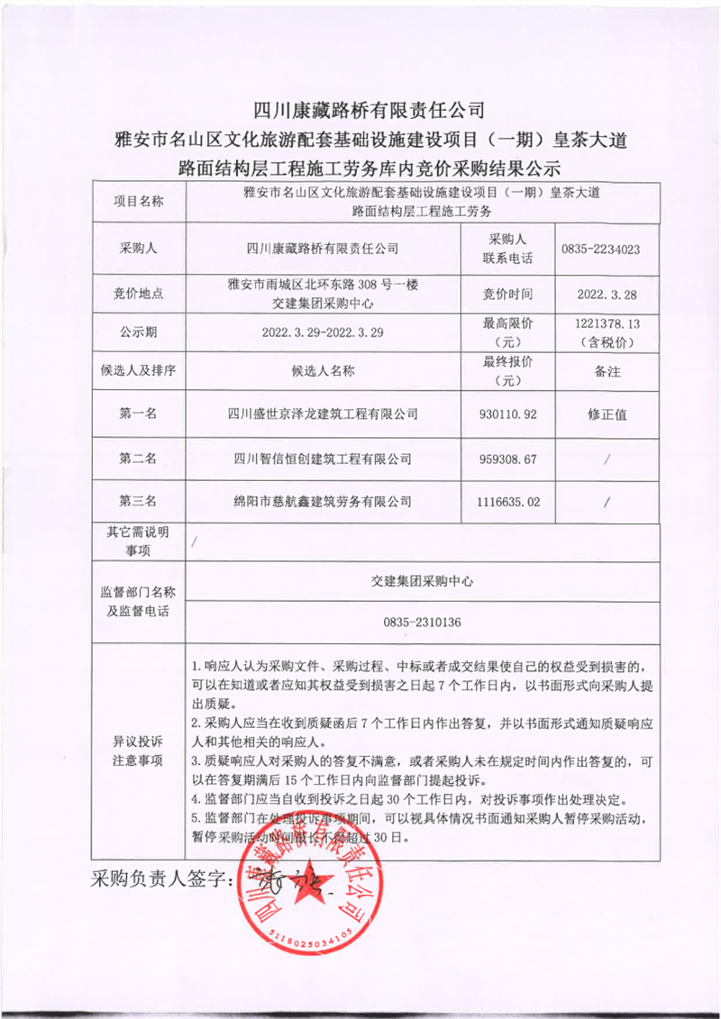 四川康藏路橋有限責(zé)任公司雅安市名山區(qū)文化旅游配套基礎(chǔ)設(shè)施建設(shè)項(xiàng)目(一期)路面結(jié)構(gòu)層工程施工勞務(wù)庫(kù)內(nèi)競(jìng)價(jià)采購(gòu)結(jié)果公示