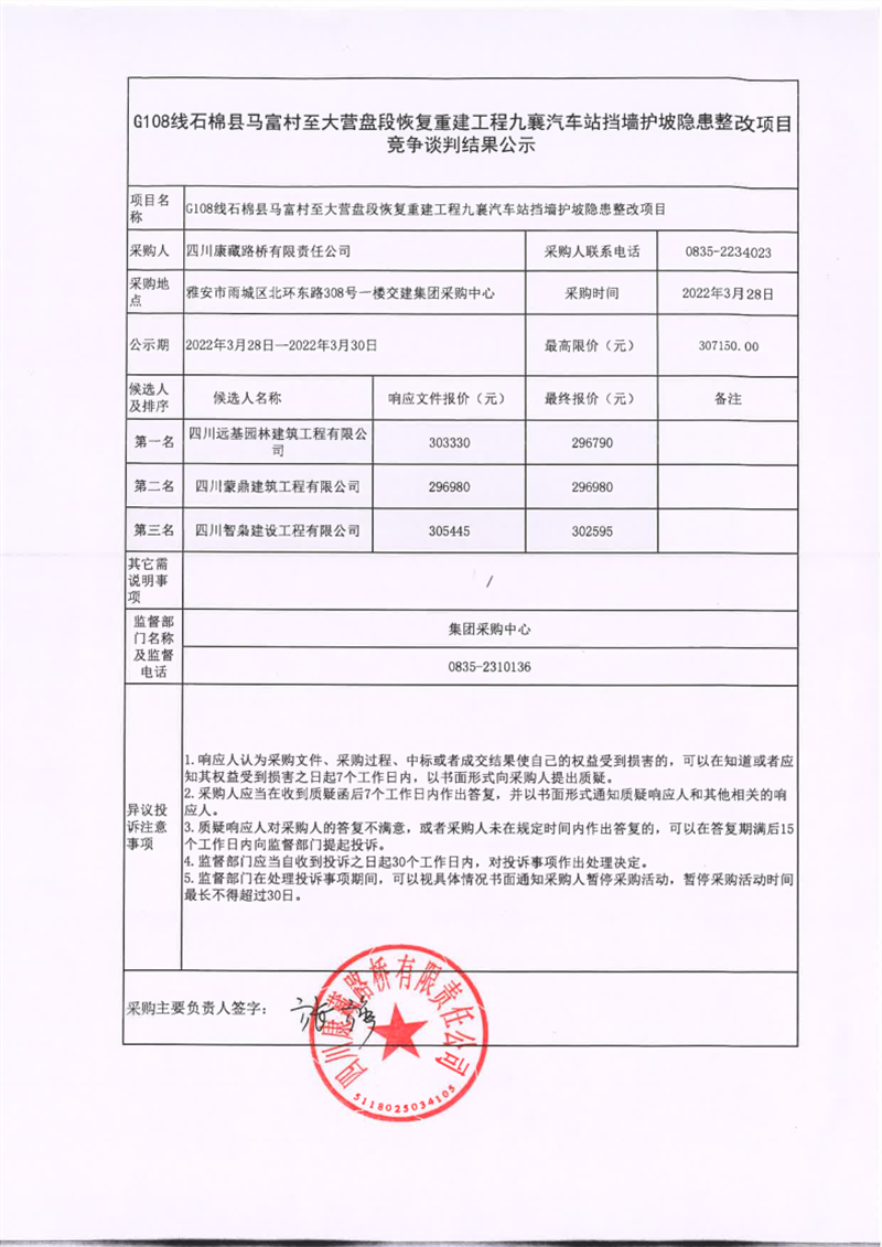 四川康藏路橋有限責任公司G108線石棉縣馬福村至大營盤段恢復重建九襄汽車站擋墻護坡隱患整改項目競爭談判結(jié)果公示