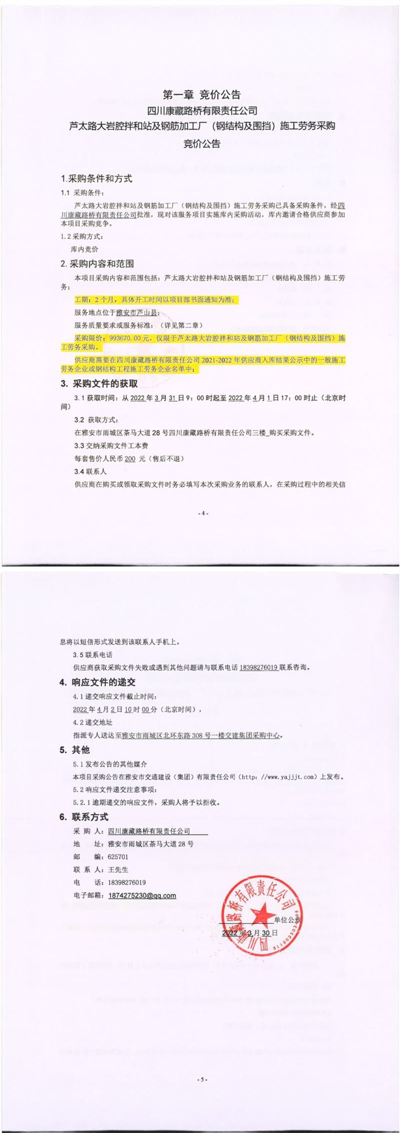 四川康藏路橋有限責(zé)任公司蘆太路大巖腔拌和站及鋼筋加工廠(鋼結(jié)構(gòu)及圍檔)施工勞務(wù)采購(gòu)競(jìng)價(jià)公告