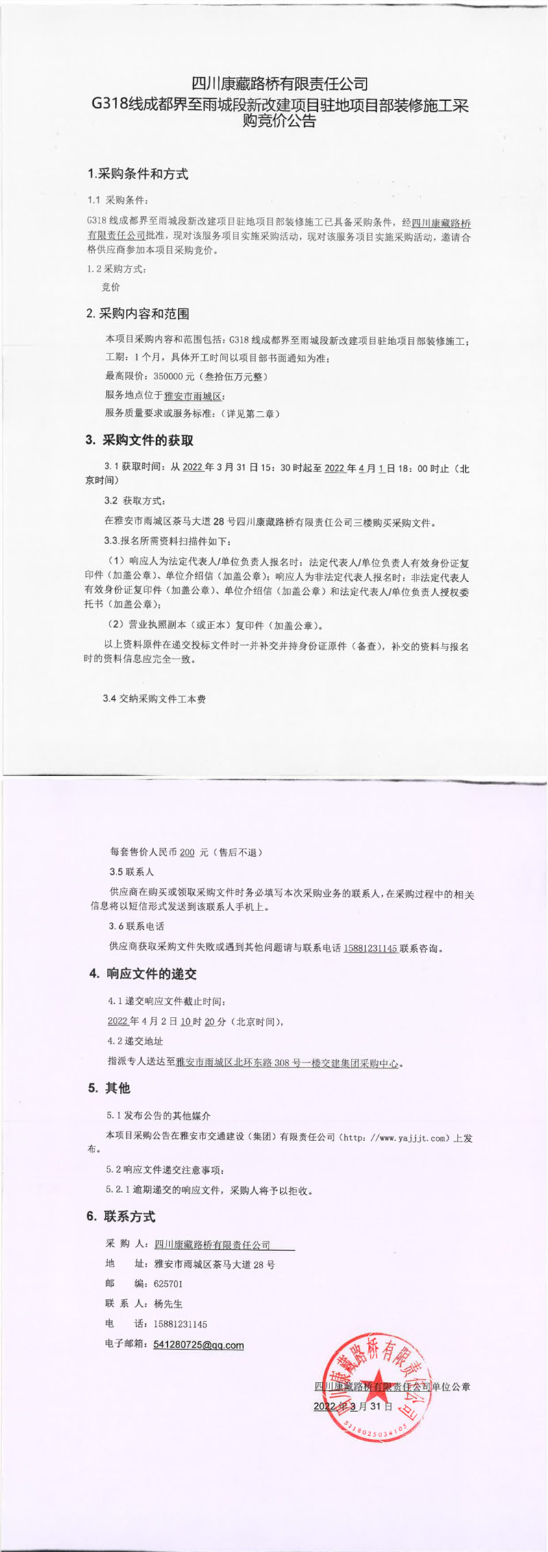 四川康藏路橋有限責(zé)任公司G318線成都界至雨城段新改建項(xiàng)目駐地項(xiàng)目部裝修施工采購(gòu)競(jìng)價(jià)公告