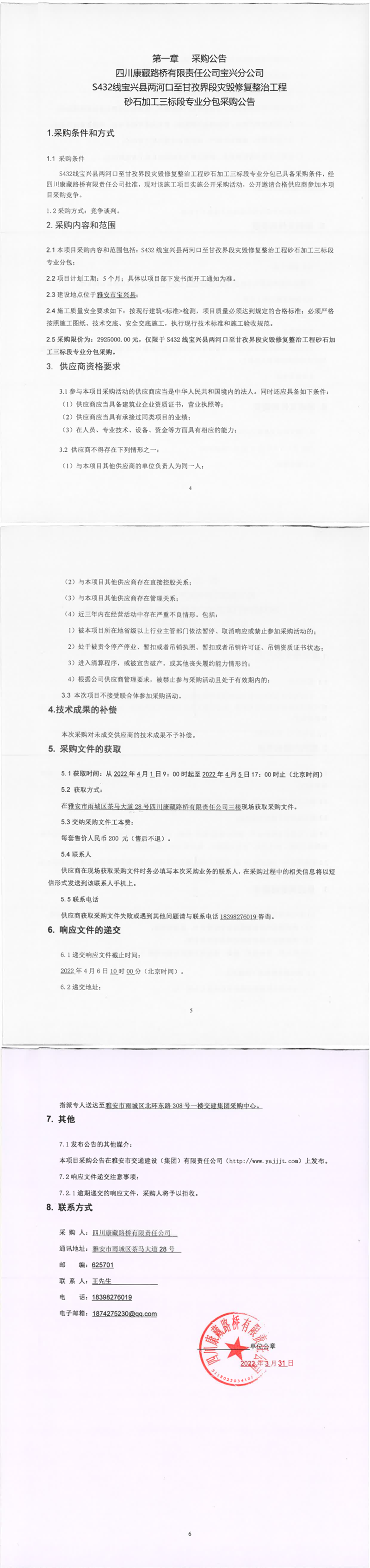 四川康藏路橋有限責任公司S432線寶興縣兩河口至甘孜界段災毀修復整治工程砂石加工三標段專業(yè)分包采購公告