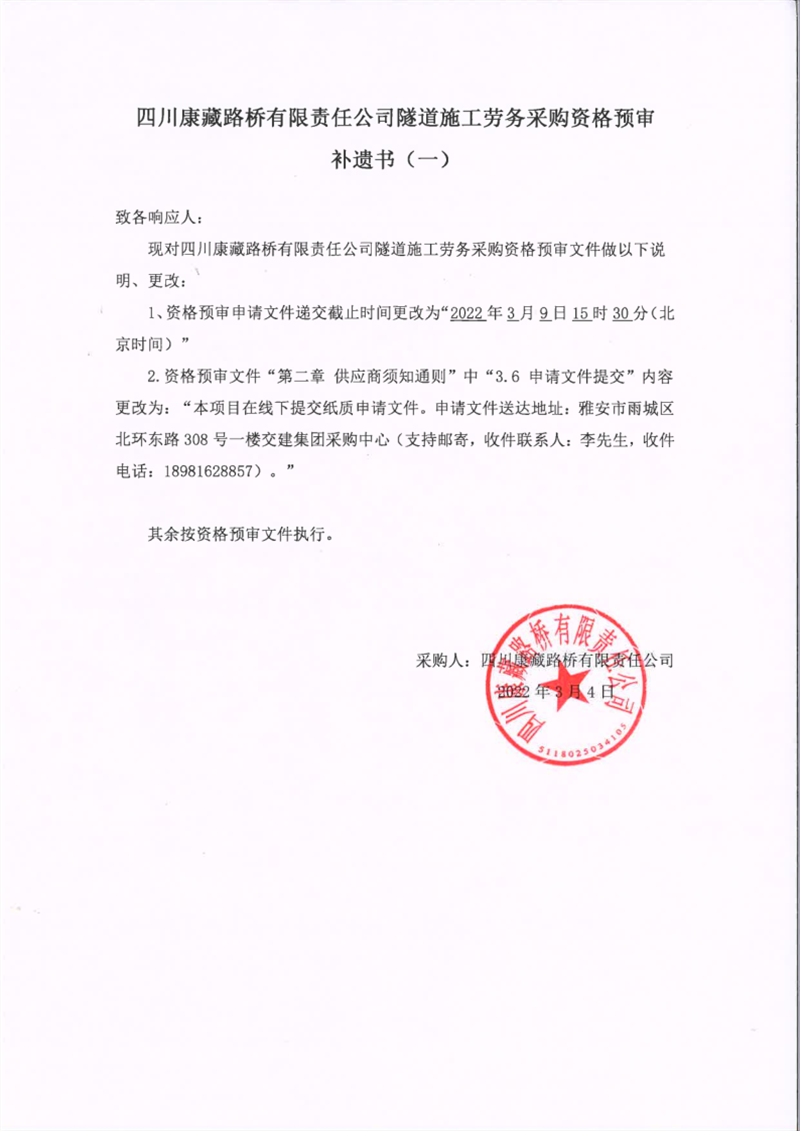 四川康藏路橋有限責任公司隧道施工勞務(wù)采購資格預審補遺書(一)