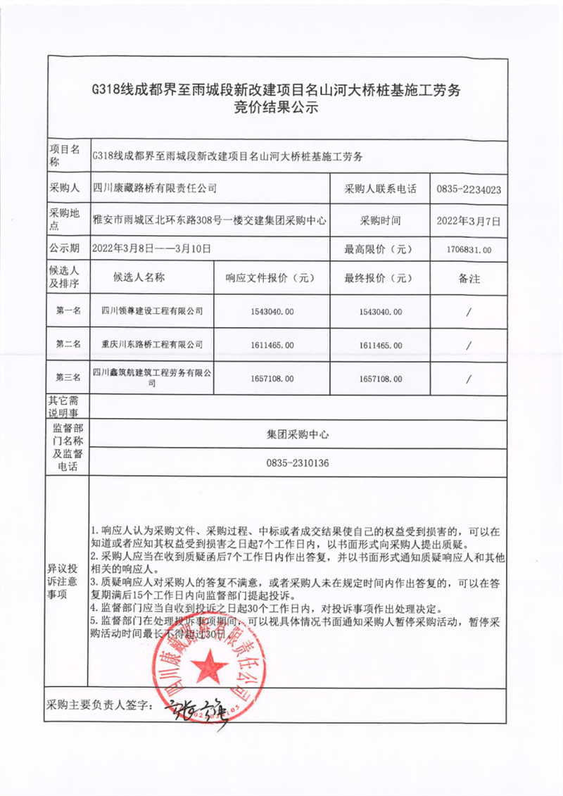 四川康藏路橋有限責任公司G318線成都界至雨城段新改建項目名山河大橋樁基施工勞務競價結(jié)果公示