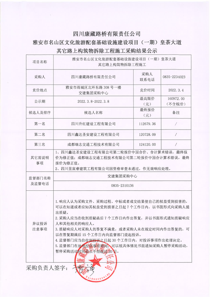 四川康藏路橋有限責任公司雅安市名山區(qū)文化旅游配套基礎設施建設項目(一期)皇茶大道其它路上構(gòu)筑物拆除工程施工采購結(jié)果公示