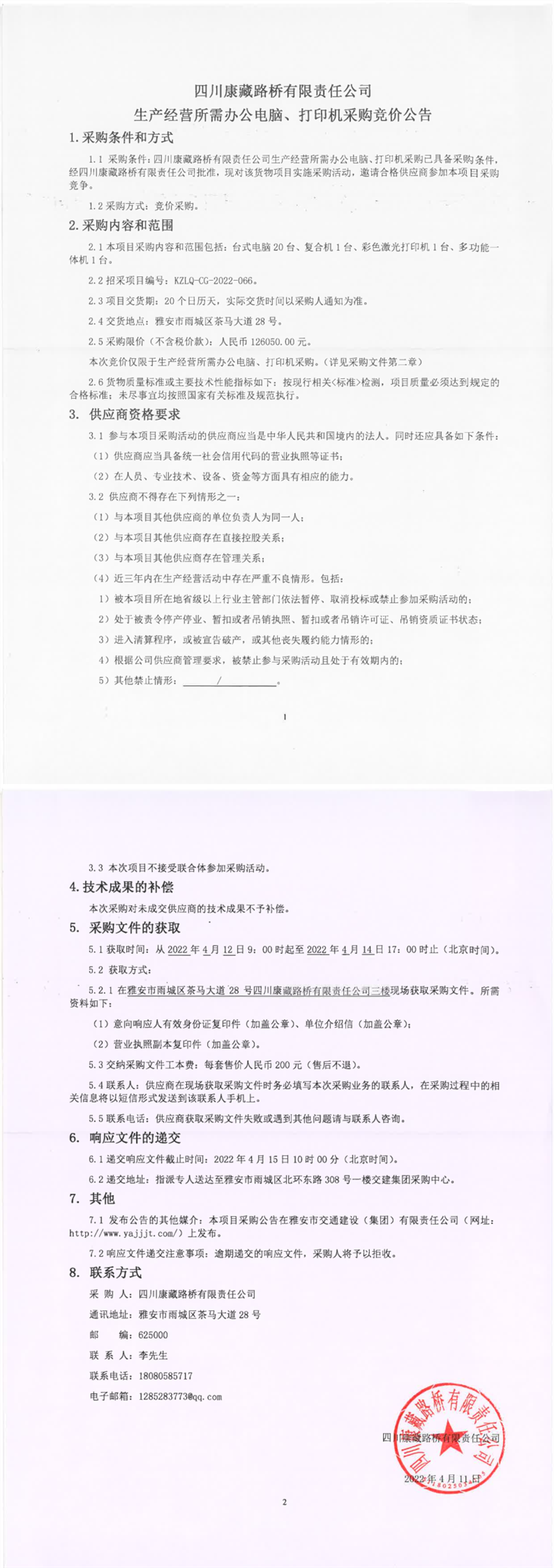 四川康藏路橋有限責(zé)任公司生產(chǎn)經(jīng)營所需辦公電腦、打印機(jī)采購競(jìng)價(jià)公告