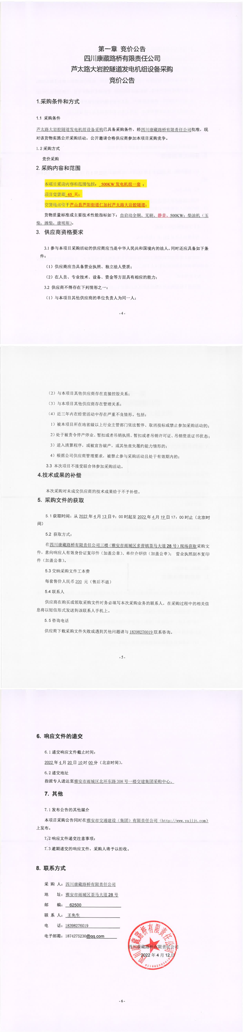 四川康藏路橋有限責(zé)任公司蘆太路大巖腔隧道發(fā)電機(jī)組設(shè)備采購競價(jià)公告