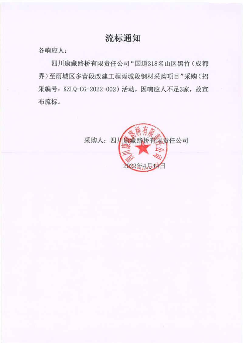 四川康藏路橋有限責(zé)任公司國(guó)道318名山區(qū)黑竹(成都界)至雨城區(qū)多營(yíng)段改建工程雨城段鋼材采購(gòu)項(xiàng)目流標(biāo)通知