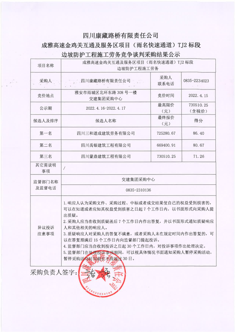 四川康藏路橋有限責(zé)任公司成雅高速金雞關(guān)互通及服務(wù)區(qū)項(xiàng)目(雨名快速通道)TJ2標(biāo)段邊坡防護(hù)工程施工勞務(wù)競爭談判采購結(jié)果公示