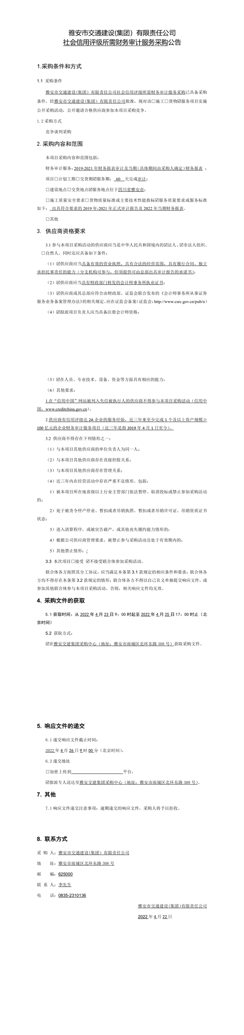 雅安市交通建設(shè)(集團(tuán))有限責(zé)任公司社會信用評級所需財(cái)務(wù)審計(jì)服務(wù)采購公告