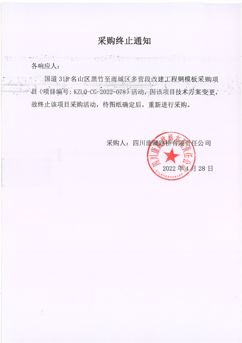 四川康藏路橋有限責任公司國道318名山區(qū)黑竹至雨城區(qū)多營段改建工程鋼模板采購終止通知
