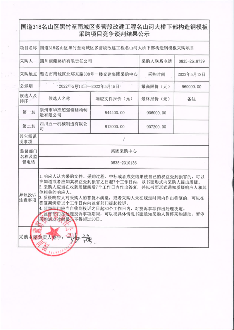 四川康藏路橋有限責(zé)任公司國道318名山區(qū)黑竹至雨城區(qū)多營段改建工程名山河大橋下部構(gòu)造鋼模板采購項(xiàng)目競(jìng)爭(zhēng)談判結(jié)果公示