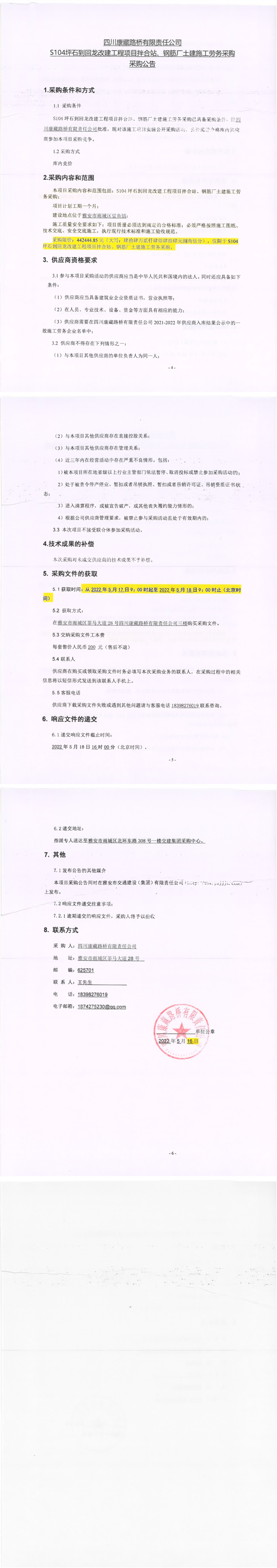 四川康藏路橋有限責任公司S104坪石到回龍改建工程項目拌合站、鋼筋廠土建施工勞務(wù)采購采購公告