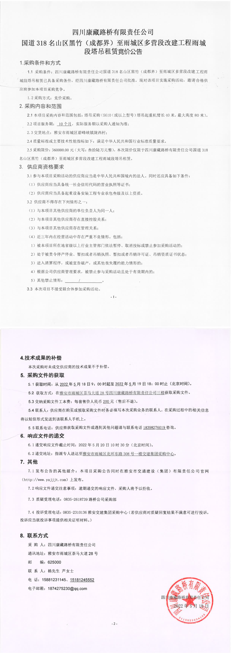 四川康藏路橋有限責(zé)任公司國道318名山區(qū)黑竹(成都界)至雨城區(qū)多營段改建工程雨城段塔吊租賃競(jìng)價(jià)公告