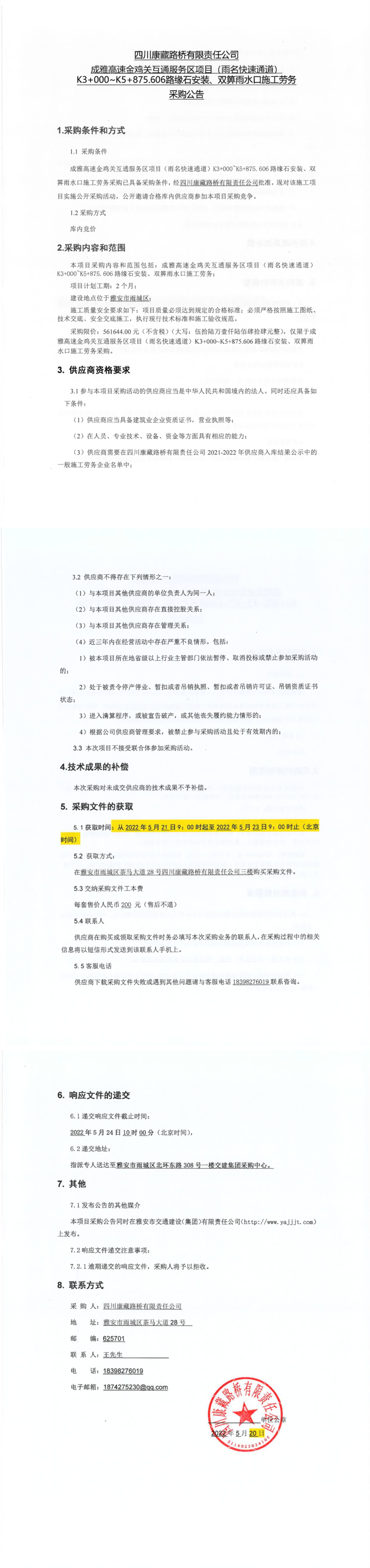 四川康藏路橋有限責(zé)任公司成雅高速金雞關(guān)互通服務(wù)區(qū)項(xiàng)目(雨名快速通道)K3+000-K5+875.606路緣石安裝、雙箅雨水口施工勞務(wù)采購(gòu)公告