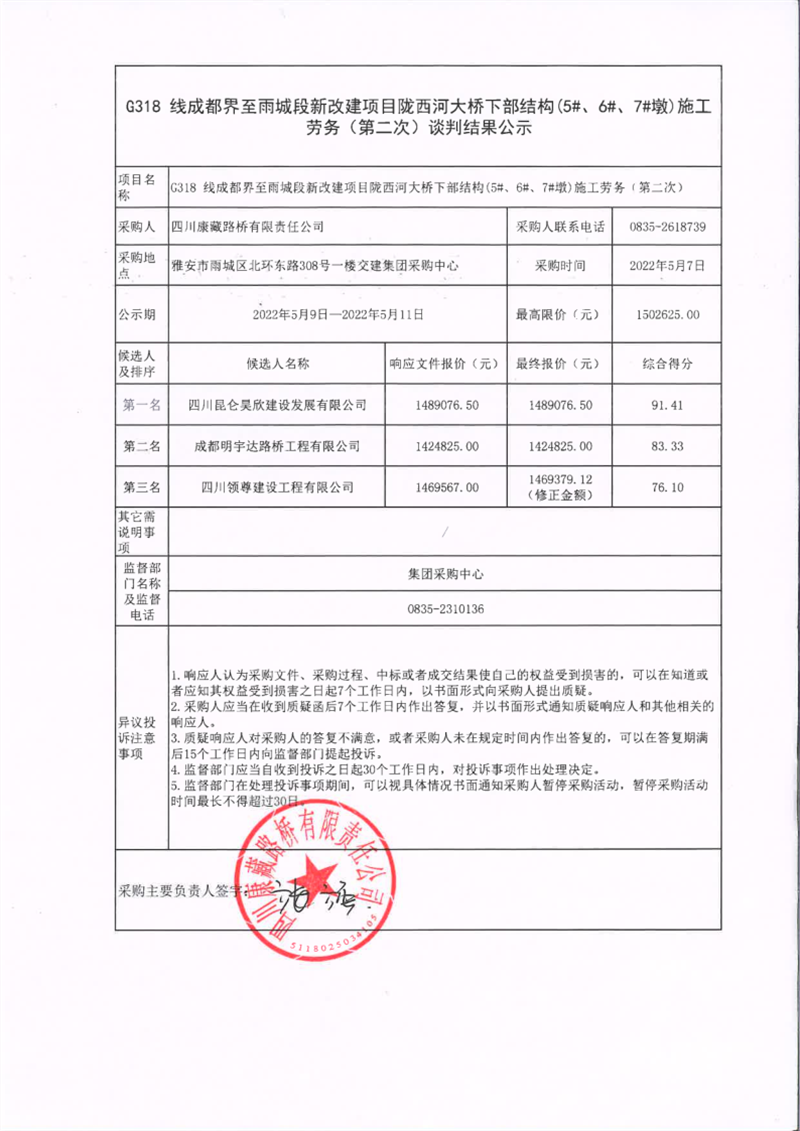 四川康藏路橋有限責任公司G318線成都界至雨城段新改建項目隴西河大橋下部結(jié)構(gòu)(5#、6#、7#墩)施工勞務(第二次)談判結(jié)果公示