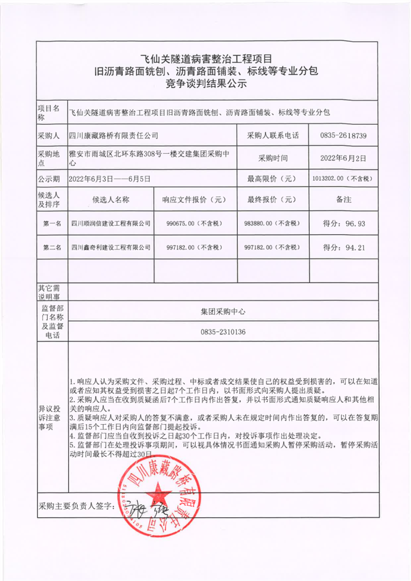 四川康藏路橋有限責任公司飛仙關(guān)隧道病害整治工程項目舊瀝青路面銑刨、瀝青路面鋪裝、標線等專業(yè)分包競爭談判結(jié)果公示