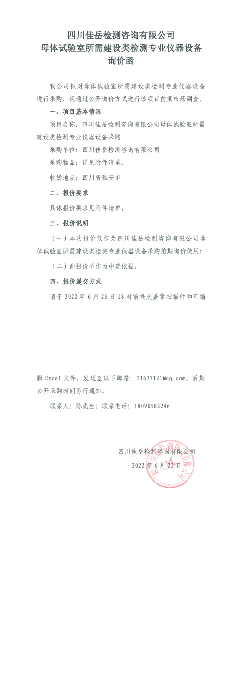四川佳岳檢測(cè)咨詢有限公司母體試驗(yàn)室所需建設(shè)類(lèi)檢測(cè)專(zhuān)業(yè)儀器設(shè)備詢價(jià)函