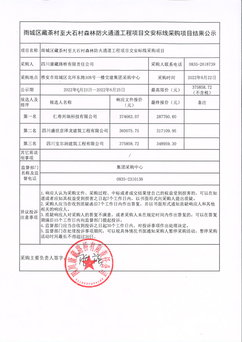 四川康藏路橋有限責(zé)任公司雨城區(qū)藏茶村至大石村森林防火通道工程項目交安標(biāo)線采購項目結(jié)果公示
