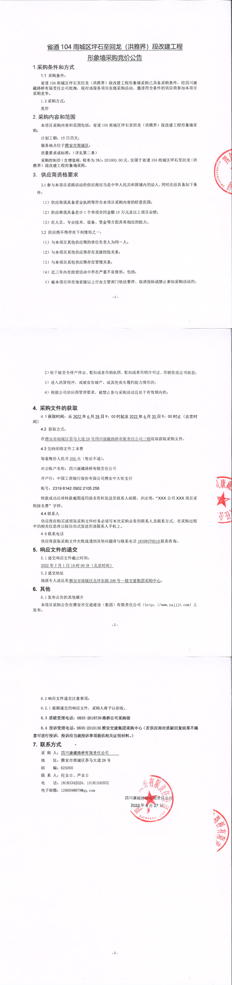 四川康藏路橋有限責(zé)任公司省道104雨城區(qū)坪石至回龍(洪雅界)段改建工程形象墻采購競價公告