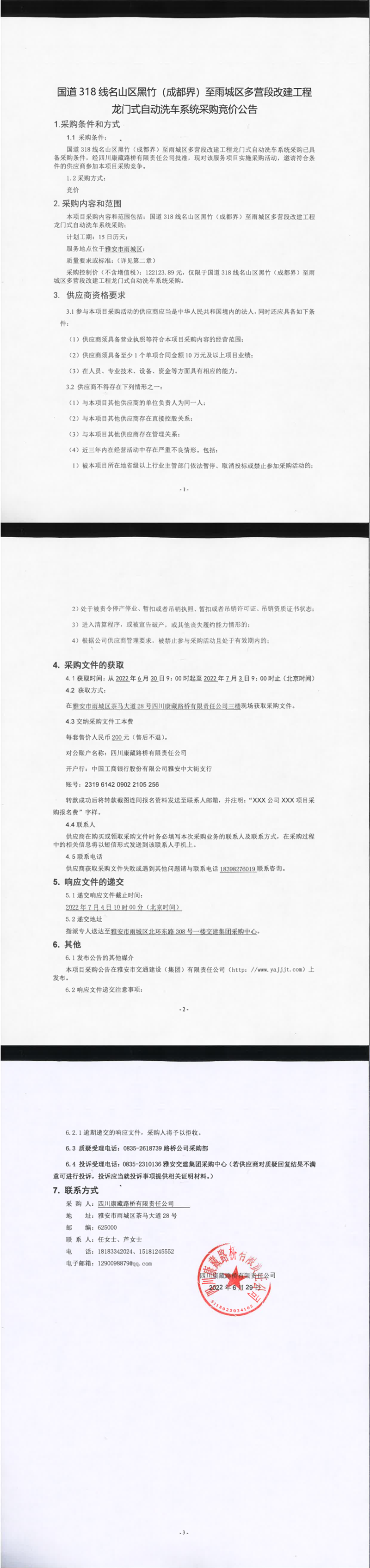 四川康藏路橋有限責(zé)任公司國(guó)道318線名山區(qū)黑竹(成都界)至雨城區(qū)多營(yíng)段改建工程龍門(mén)式自動(dòng)洗車(chē)系統(tǒng)采購(gòu)競(jìng)價(jià)公告