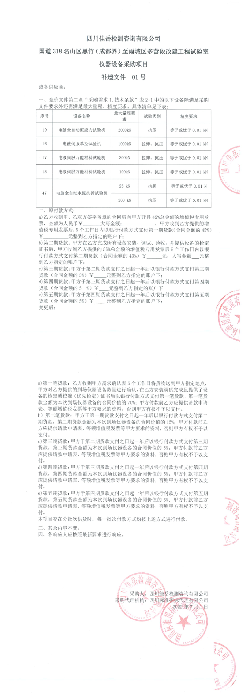 四川佳岳檢測咨詢有限公司國道318名山區(qū)黑竹(成都界)至雨城區(qū)多營段改建工程試驗室儀器設備采購項目補遺文件01號