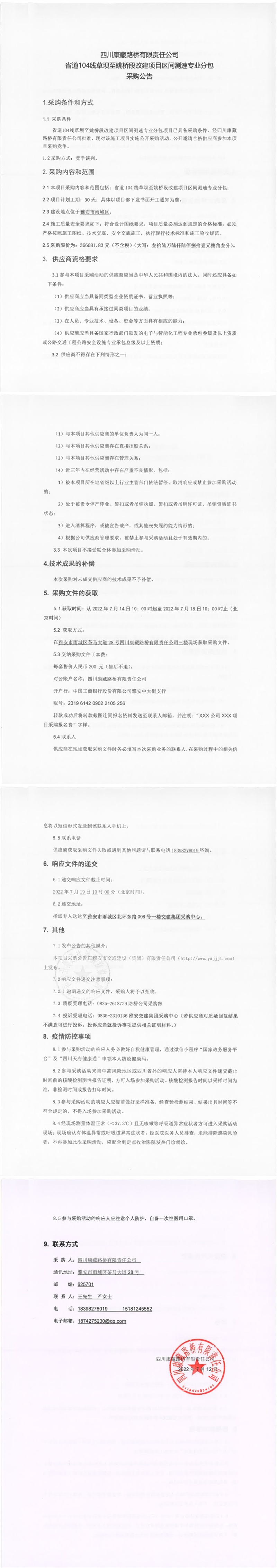 四川康藏路橋有限責(zé)任公司省道104線草壩至姚橋段改建項(xiàng)目區(qū)間測速專業(yè)分包采購公告