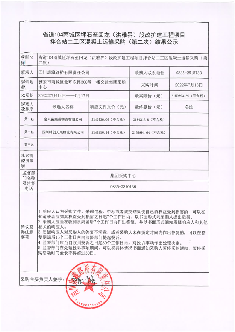 四川康藏路橋有限責任公司省道104線雨城區(qū)坪石至回龍(洪雅界)段改擴建工程項目拌合站二工區(qū)混凝土運輸采購(第二次)結果公示