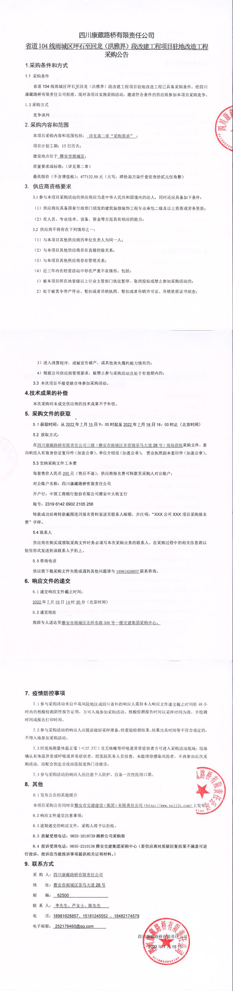 四川康藏路橋有限責(zé)任公司省道104線雨城區(qū)坪石至回龍(洪雅界)段改建工程項(xiàng)目駐地改造工程采購公告