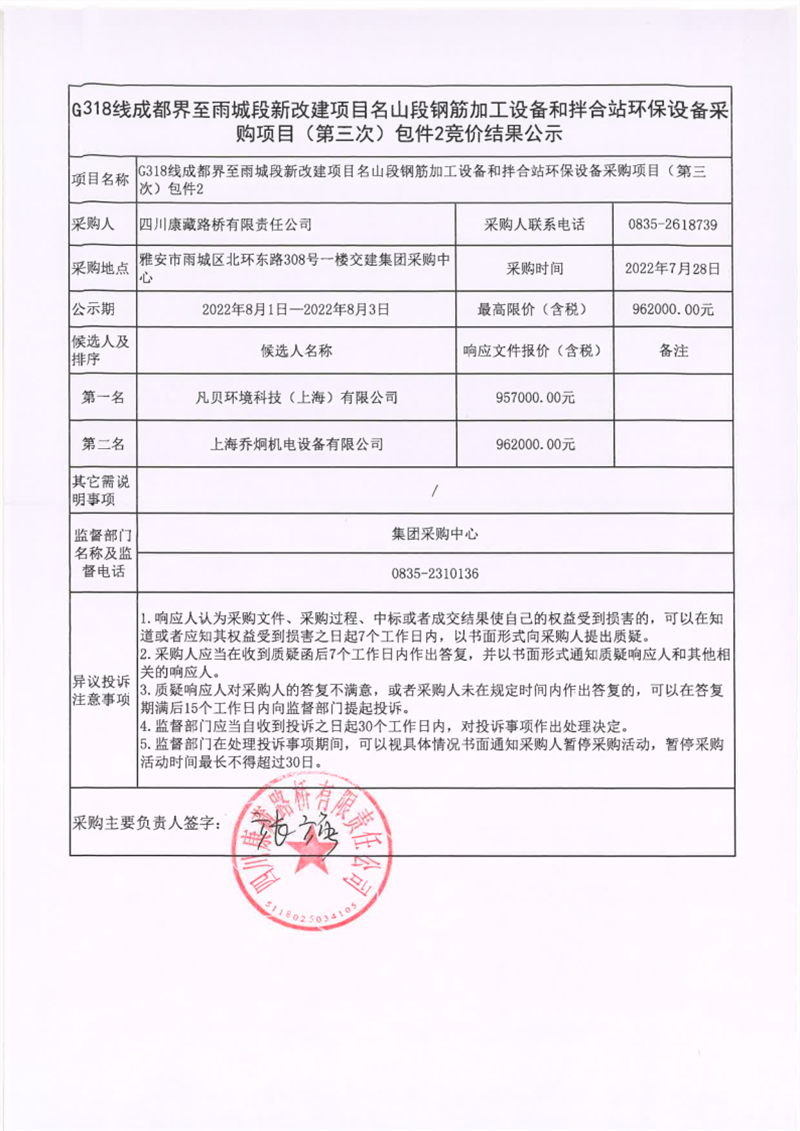 四川康藏路橋有限責任公司G318線成都界至雨城段新改建項目名山段鋼筋加工設(shè)備和拌合站環(huán)保設(shè)備采購項目(第三次)包件2競價結(jié)果公示