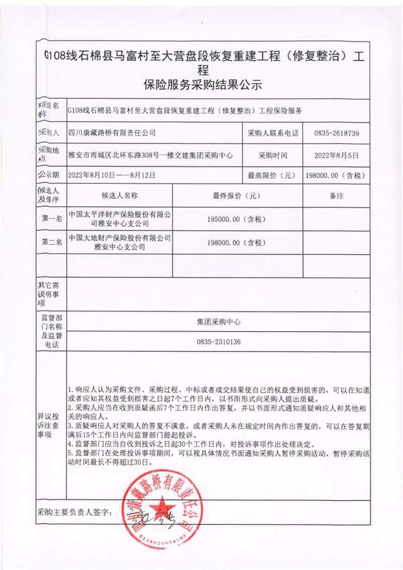 四川康藏路橋有限責(zé)任公司G108線石棉縣馬富村至大營盤段恢復(fù)重建工程(修復(fù)整治)工程保險(xiǎn)服務(wù)采購結(jié)果公示