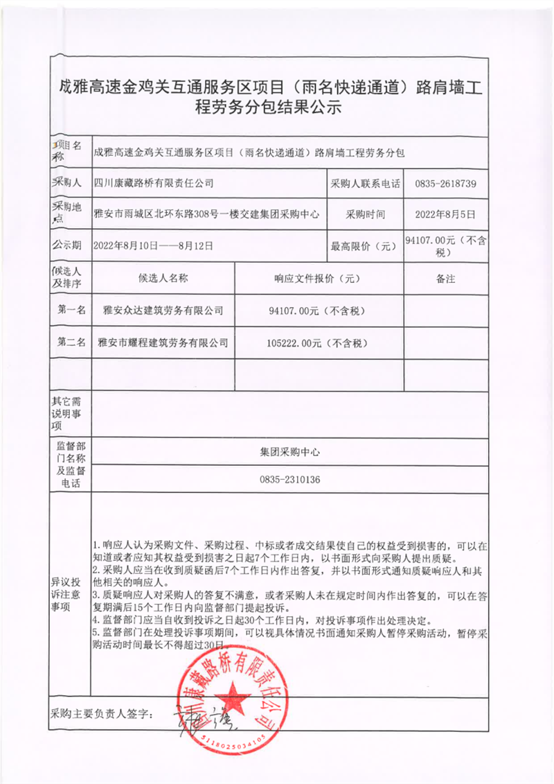 四川康藏路橋有限責任公司成雅高速金雞關(guān)互通服務區(qū)項目(雨名快速通道)路肩墻工程勞務分包結(jié)果公示