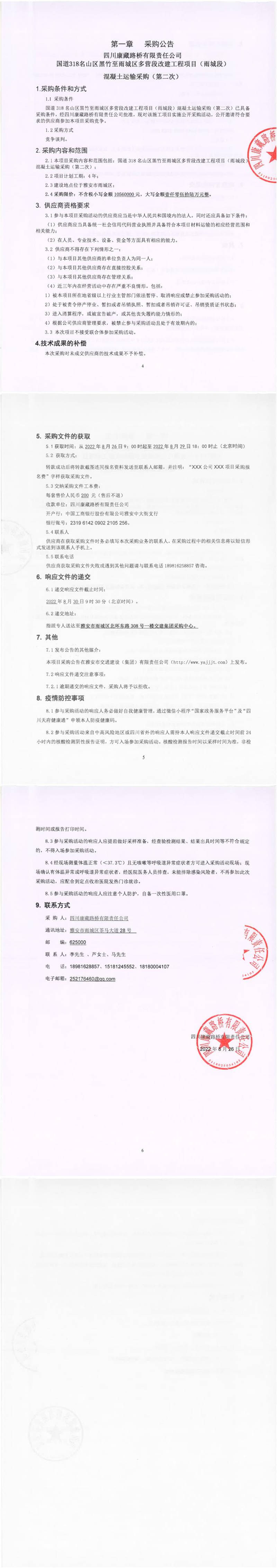 四川康藏路橋有限責任公司國道318名山區(qū)黑竹至雨城區(qū)多營段改建工程項目(雨城段)混凝土運輸(第二次)采購公告