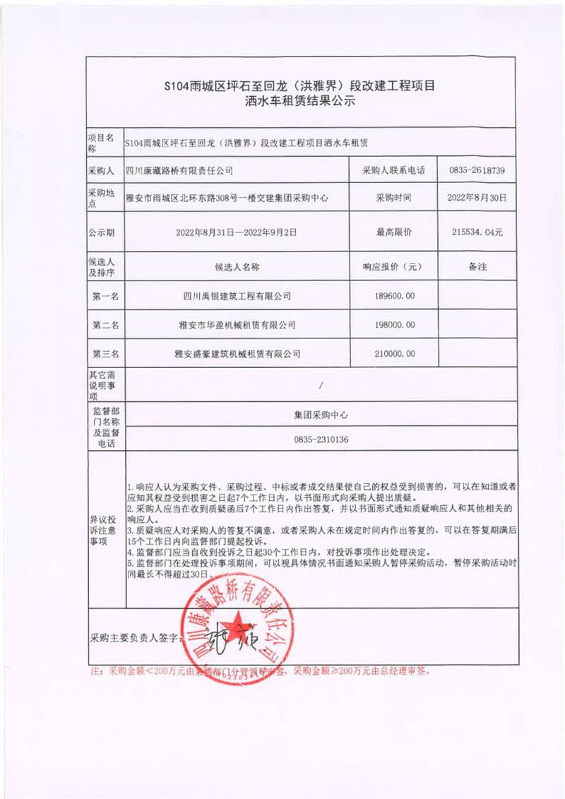 四川康藏路橋有限責(zé)任公司S104雨城區(qū)坪石至回龍(洪雅界)段改建工程項目灑水車租賃結(jié)果公示