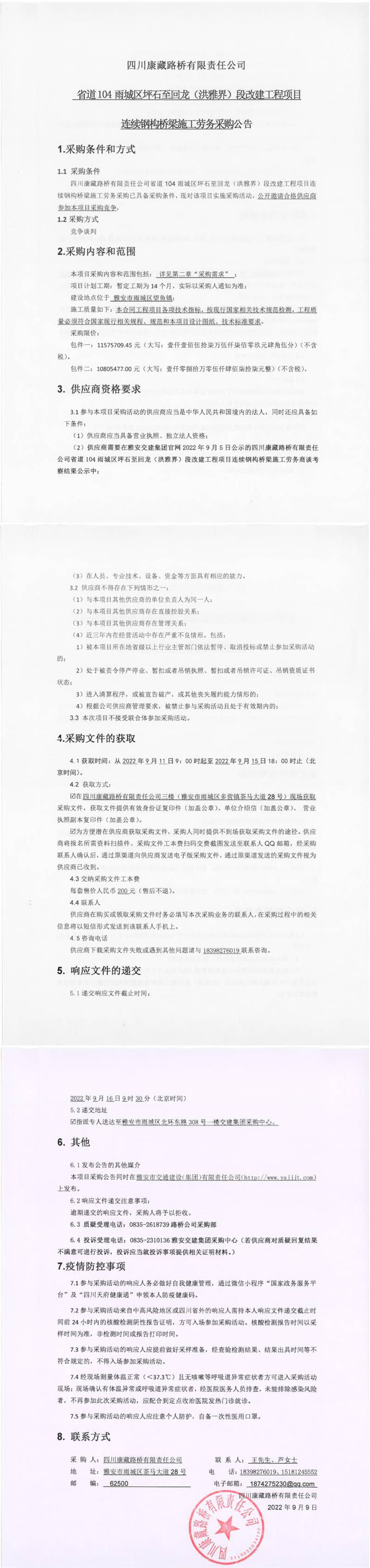 四川康藏路橋有限責(zé)任公司省道104雨城區(qū)坪石至回龍(洪雅界)段改建工程項(xiàng)目連續(xù)鋼構(gòu)橋梁施工勞務(wù)采購(gòu)公告