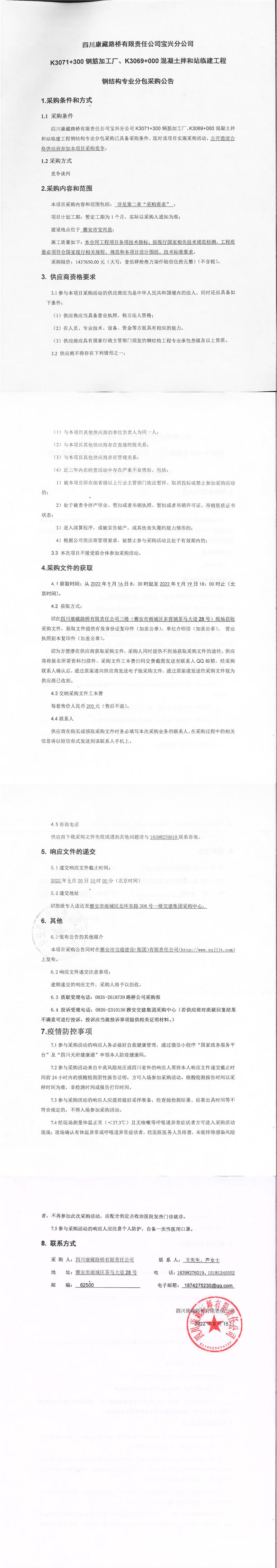 四川康藏路橋有限責任公司寶興分公司K3071+300鋼筋加工廠、K3069+000混凝土拌和站臨建工程鋼結構專業(yè)分包采購公告