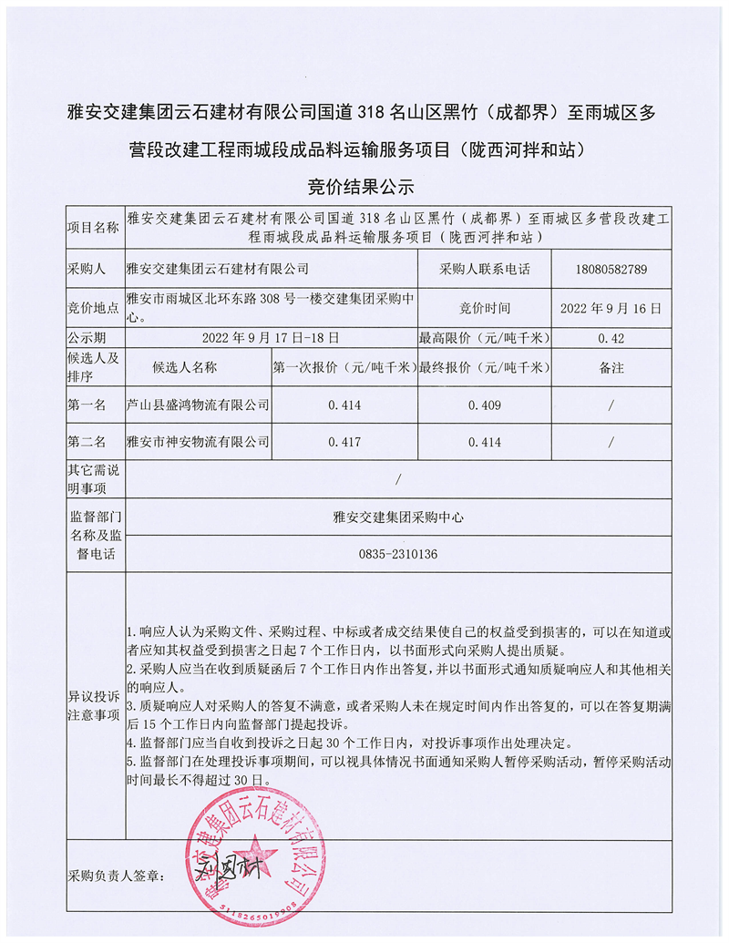 雅安交建集團(tuán)云石建材有限公司國道318名山區(qū)黑竹(成都界)至雨城區(qū)多營段改建工程雨城段成品料運(yùn)輸服務(wù)項目(皇茶大道拌和站)競價結(jié)果公示