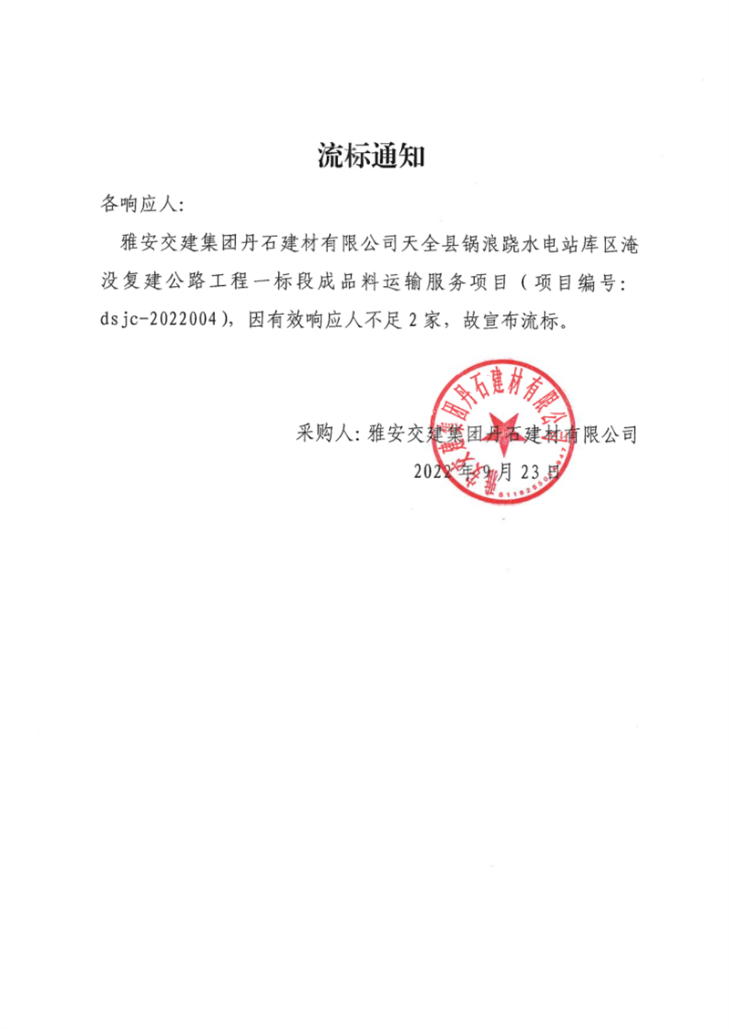 雅安交建集團(tuán)丹石建材有限公司天全縣鍋浪蹺水電站庫區(qū)淹沒復(fù)建公路工程一標(biāo)段成品料運(yùn)輸服務(wù)項目流標(biāo)通知