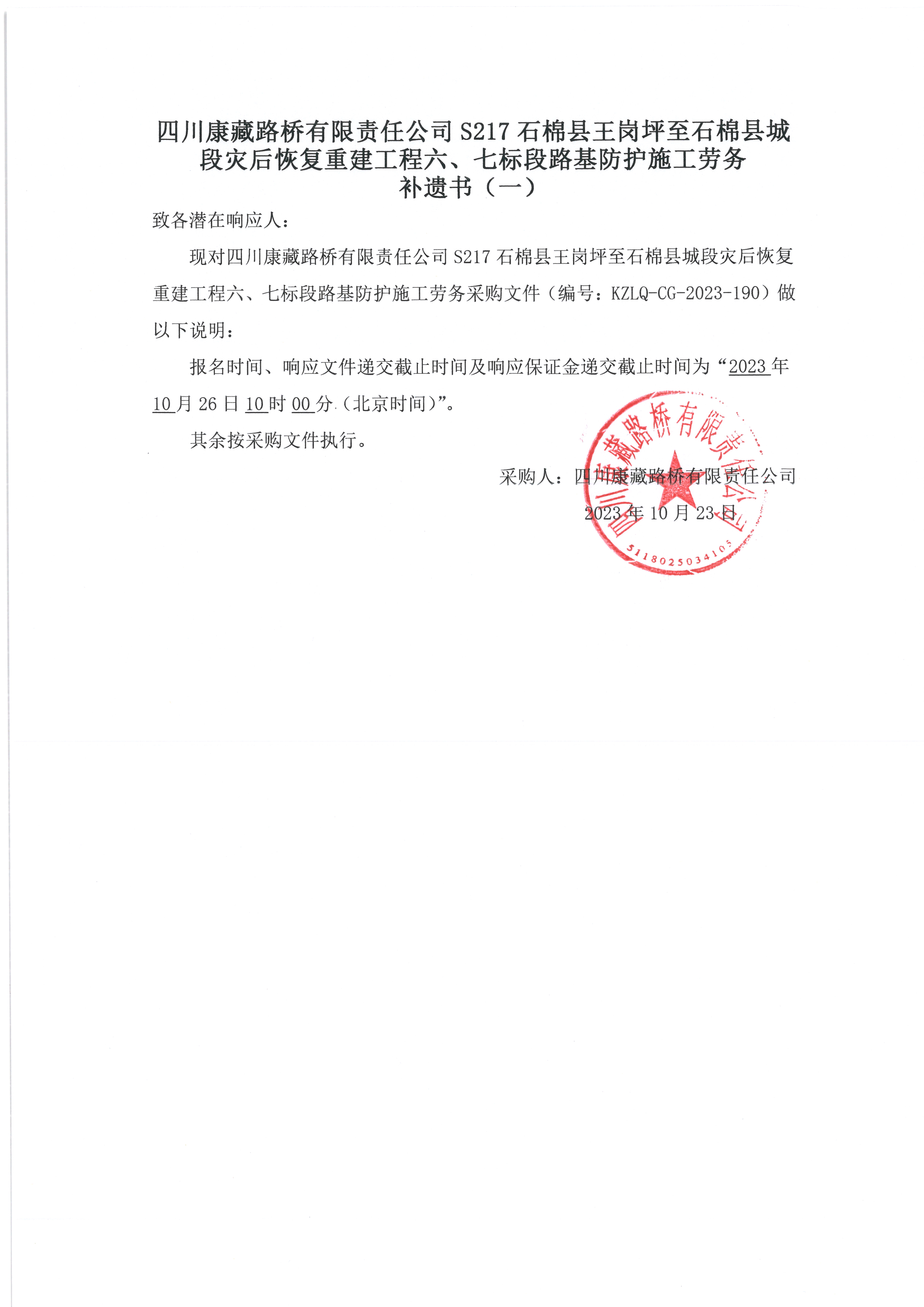 四川康藏路橋有限責(zé)任公司S217石棉縣王崗坪至石棉縣城段災(zāi)后恢復(fù)重建工程六、七標段路基防護施工勞務(wù) 補遺書(一)