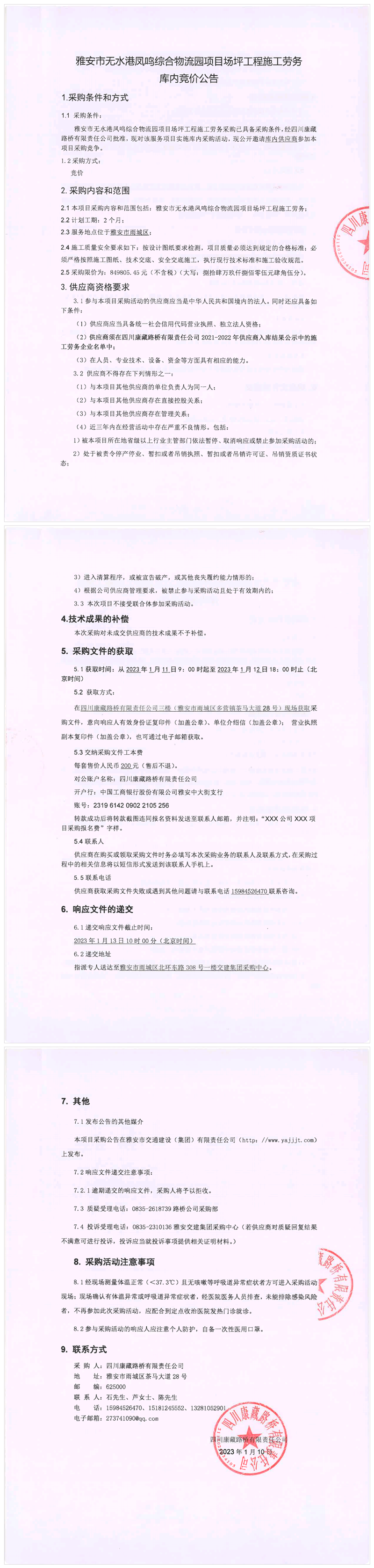四川康藏路橋有限責(zé)任公司雅安市無(wú)水港鳳鳴綜合物流園項(xiàng)目場(chǎng)坪工程施工勞務(wù)庫(kù)內(nèi)競(jìng)價(jià)公告